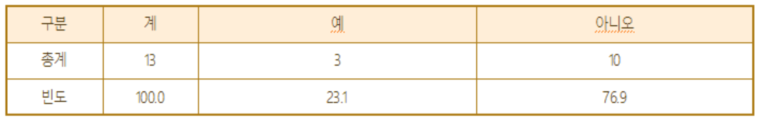 본 질문 관련 조사 분석 결과는 매우 의외였다. 당연히 ‘예’라는 응답이 압도적으로 많이 나올 것이라고 예상을 했는데, 오히려 ‘아니오’라는 답변이 76.9%(10명)로 높게 나왔던 것이다. 이와 같은 결과를 어떻게 이해해야 할까.