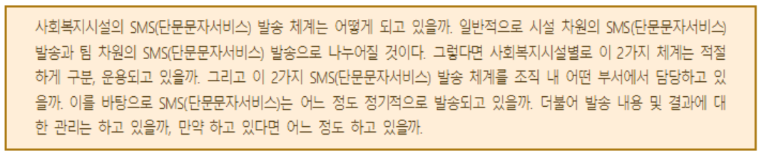 - 사회복지시설의 SMS(단문문자서비스) 운영 주목적에 부합하는 체계 수립 및 이와 관련된 실무 매뉴얼 연구, 개발이 필요하다.