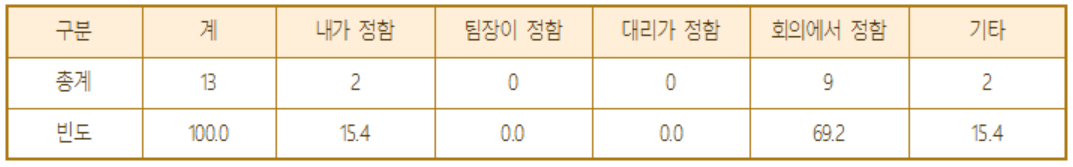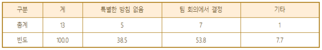 ‘3-2-7-2. 팀내 SMS 발송 내용은 어떻게 결정되는가.’라는 질문에 대해서는 ‘회의에서 정한다.’가 69.2%(9명)이었는데, ‘팀내 SMS 발송 내용은 언제 결정되는가.’라고 질문하자 ‘팀 회의에서 결정된다.’는 응답이 53.8%(7명)로 낮아진 반면에, ‘특별한 방침이 없다.’라는 답변이 38.5%(5명)로 높아진 것이다.