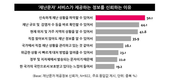 이와 관련하여 시장조사전문기업인 엠브레인 트렌드모니터에서 전국 만 15세-64세 남녀 1,000명을 대상으로 2020년도에 실시한 ‘국가 재난 상황’ 및 ‘재난문자 서비스’ 관련 인식 조사 결과(‘재난문자’서비스가 제공하는 정보를 신뢰하는 이유)를 참고 해보자.
