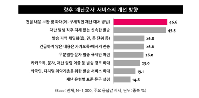 이와 관련하여 시장조사전문기업인 엠브레인 트렌드모니터에서 전국 만 15세-64세 남녀 1,000명을 대상으로 2020년도에 실시한 ‘국가 재난 상황’ 및 ‘재난문자 서비스’ 관련 인식 조사 결과(향후 ‘재난문자’ 서비스의 개선 방향)를 참고 해보자.