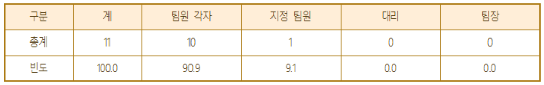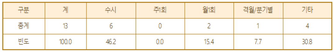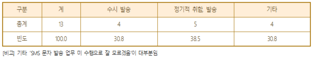 이와 관련해서 ‘팀내 SMS은 어떻게 발송되는가.’라고 질의 시, ‘정기적으로 내용을 취합, 발송하고 있다.’는 응답은 38.5%(5명)이었고, ‘수시로 발송한다.’는 응답은 30.8%(4명) 이었다.