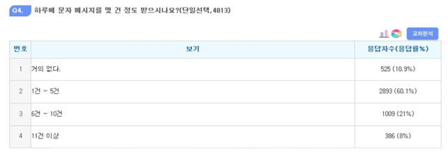 필자의 생각으로는 ‘팀장이나 대리가 정한다.’라는 응답이 0%인 것을 보면, ‘팀 회의에서 주 또는 월 단위 문자발송계획을 결정한 후 그 결과에 따른 SMS 문자발송 이행이라는 행태’는 적용되지 않고 있다고 본다. 만약 이와 같은 단계가 작동하고 있다면, 팀원 입장에서 SMS문자 발송 내용에 대한 팀장 또는 대리의 영향력(* 회의는 주 안건과 그 회의 결과가 어느 정도 그려진 상태에서 진행되는 것이 기본 성향임)에 대해 분명히 어느 정도 인지할 수밖에 없을 것이기 때문이다.
