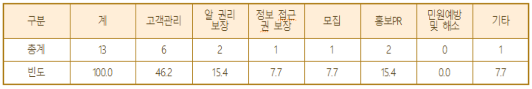 그렇다고 상기와 같은 조사 분석결과에 대해 안심만 하고 있기에는 걱정스러운 점이 있다. 그것은 사회복지시설 이용 관련 다양한 민원들 중 한 축을 형성하고 있는 것이 ‘정보’와 관련된 내용(예: 고객의 소리가 시설장까지 신속하게 전달이 되지 않는 것 같다. 사회복지시설에서 결정한 사항들이 고객들에게 신속하고, 정확하게 전달되지 않는 것 같다 등)이기 때문이다.