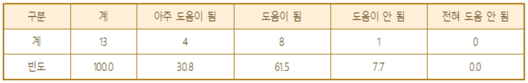 ‘SMS(단문문자서비스) 발송이 사업 및 고객 관리 등에 어느 정도 도움이 되고 있는가.”라고 질의하였는데, 이에 대해서 설문 조사자 총 13명 대비 12명(92.3%)이 ‘도움이 된다.’고 긍정적으로 응답하였다.